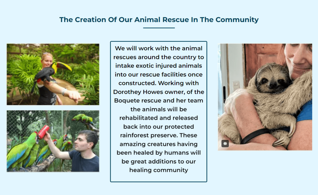 We will collaborate with animal rescue organizations across the country to intake and care for injured exotic animals at our rescue facilities once they are constructed. In partnership with Dorothy Howes, the owner of the Boquete Rescue, and her dedicated team, the animals will be rehabilitated and released back into our protected rainforest preserve. These incredible creatures, healed through human care, will become meaningful additions to our healing community.